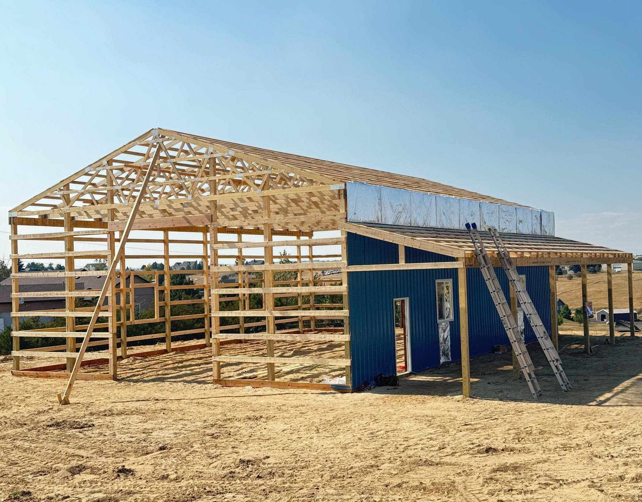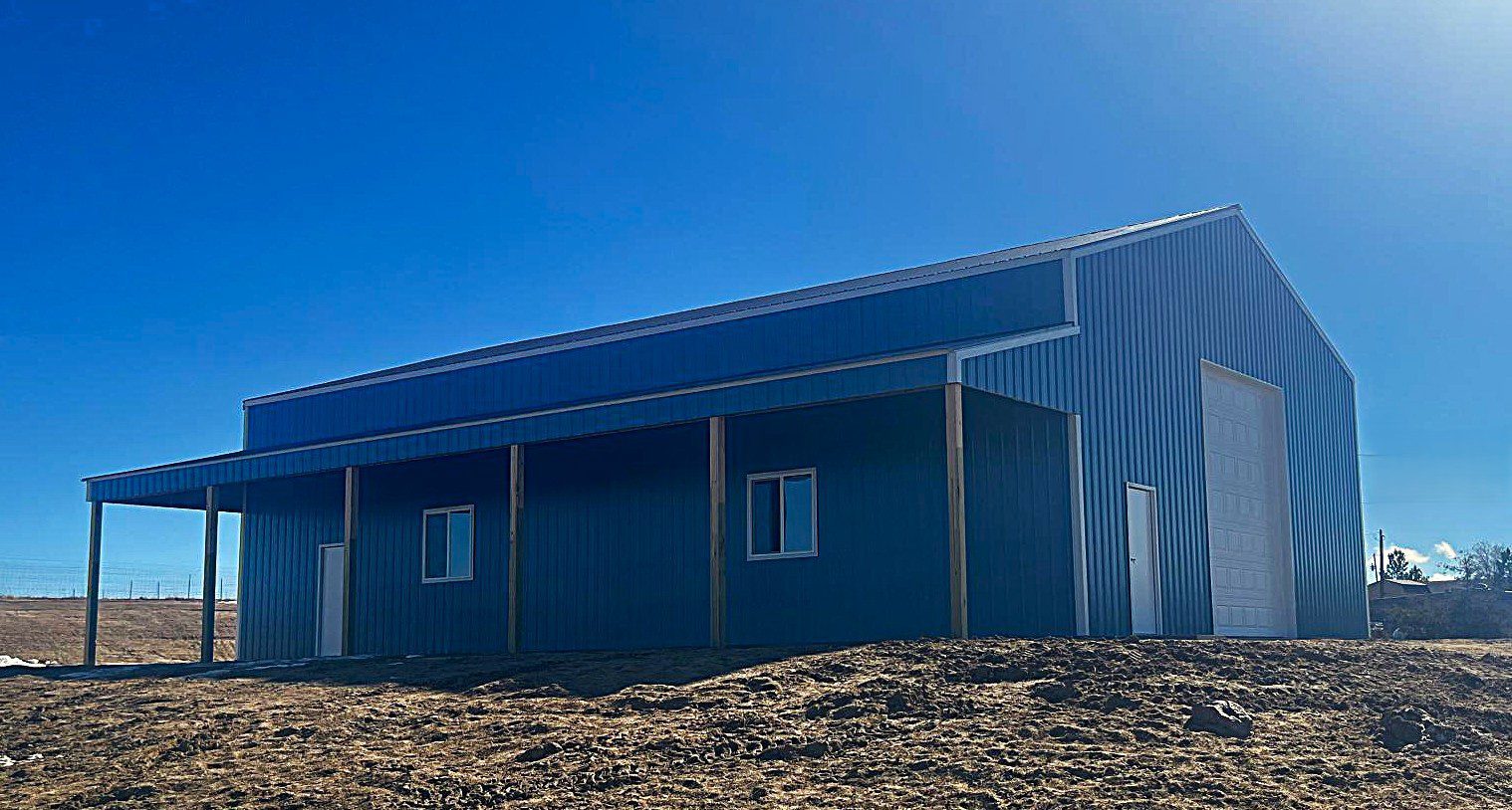 This spacious pole barn garage features a bold blue metal exterior with crisp white trim for a clean, modern look. The tall overhead opening makes it easy to move large equipment or vehicles in and out, while the walk-through door adds everyday convenience. Multiple windows help brighten the interior, and the extended porch provides extra covered space for storage or work areas. Built with durable steel siding and a wide, functional layout, this structure is designed for dependable performance and versatile use as a shop or hobby space.