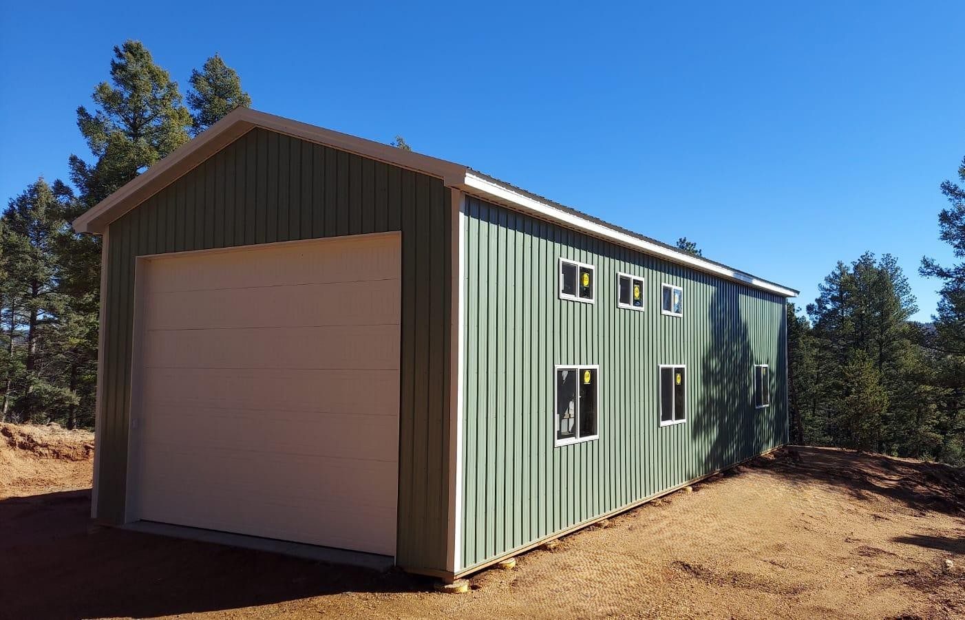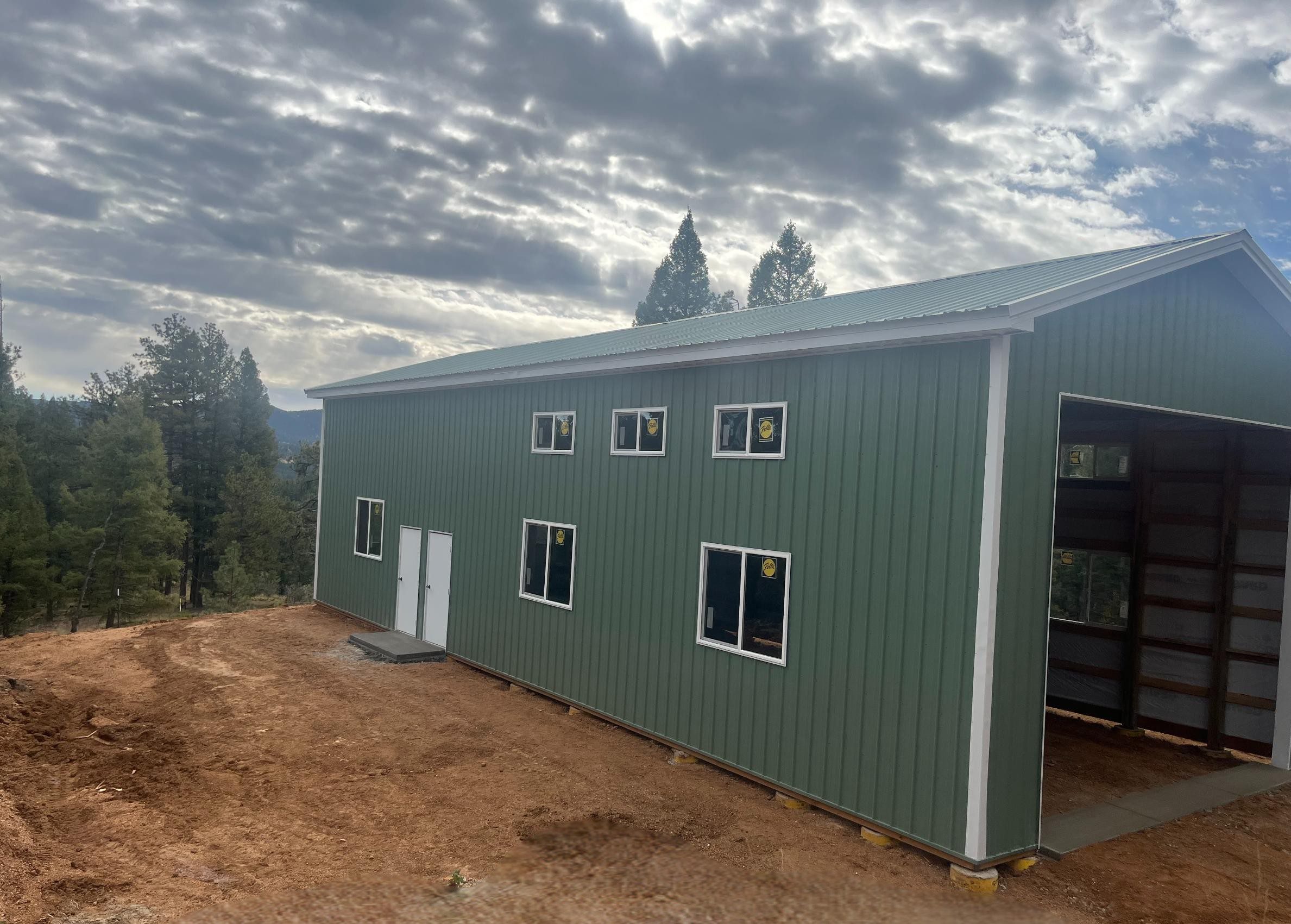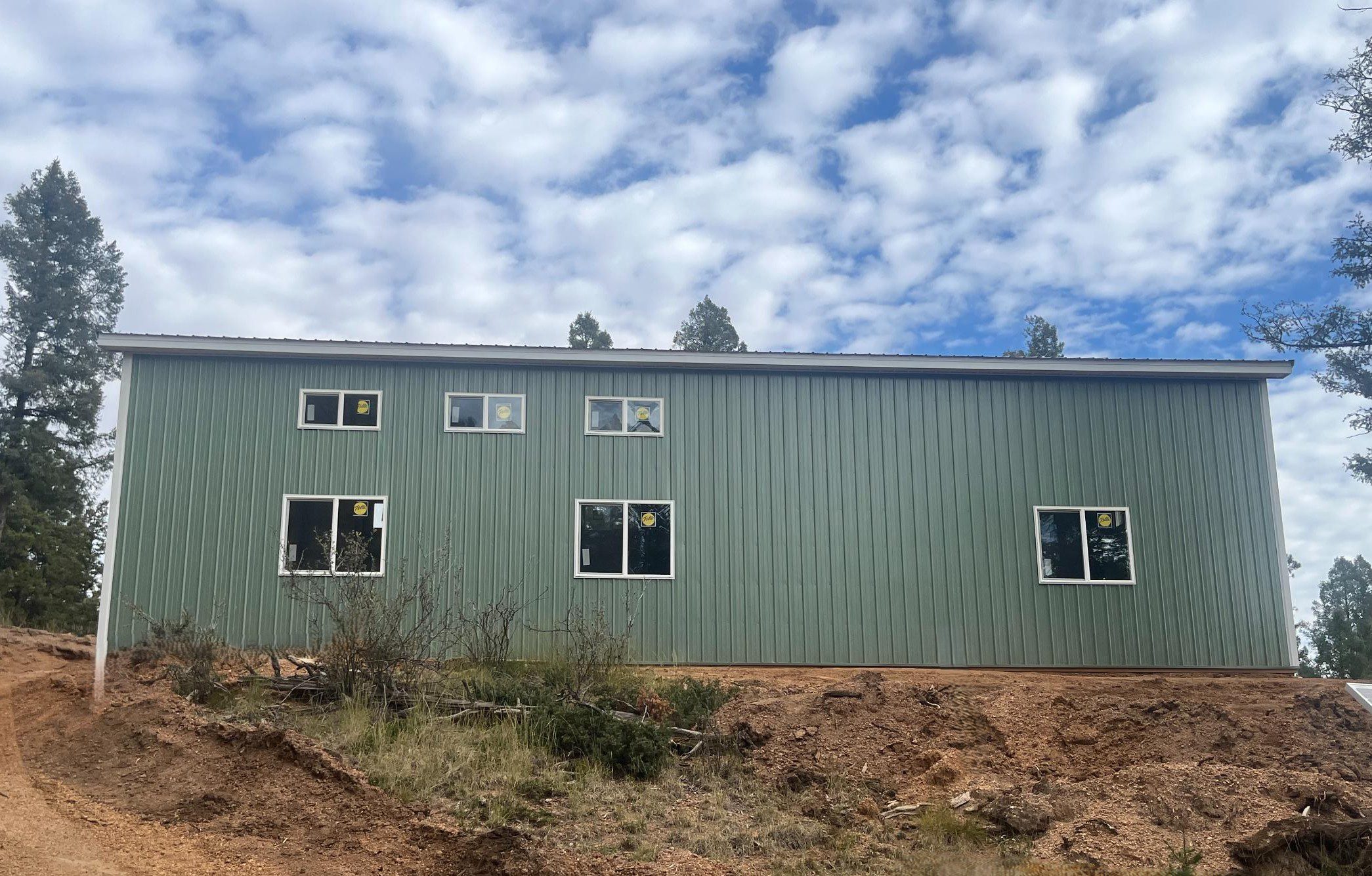 A green metal building with a large white garage door and several windows, situated on bare ground surrounded by trees under a clear blue sky. A large green metal building with multiple windows and a white garage door stands on a dirt lot under a clear blue sky. A green metal-sided building with multiple windows stands on a dirt clearing, surrounded by trees under a clear blue sky. A green metal building with white trim, several windows, and two white doors, set among pine trees under a clear blue sky. A large green metal building with multiple windows, a white door, and a tall garage door, surrounded by trees and dirt ground under a clear blue sky. A green metal-sided building with several windows sits on a dirt slope under a partly cloudy sky, surrounded by sparse trees and brush. A large, unfinished metal building with an open front, set on a dirt lot surrounded by trees under a cloudy sky. Inside a building with a dirt floor and windows A building under construction with trees and clouds in the background A green metal building with white trim and several windows, situated on bare ground with trees and a cloudy sky in the background.
