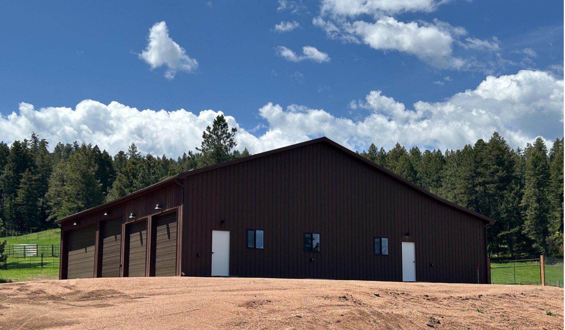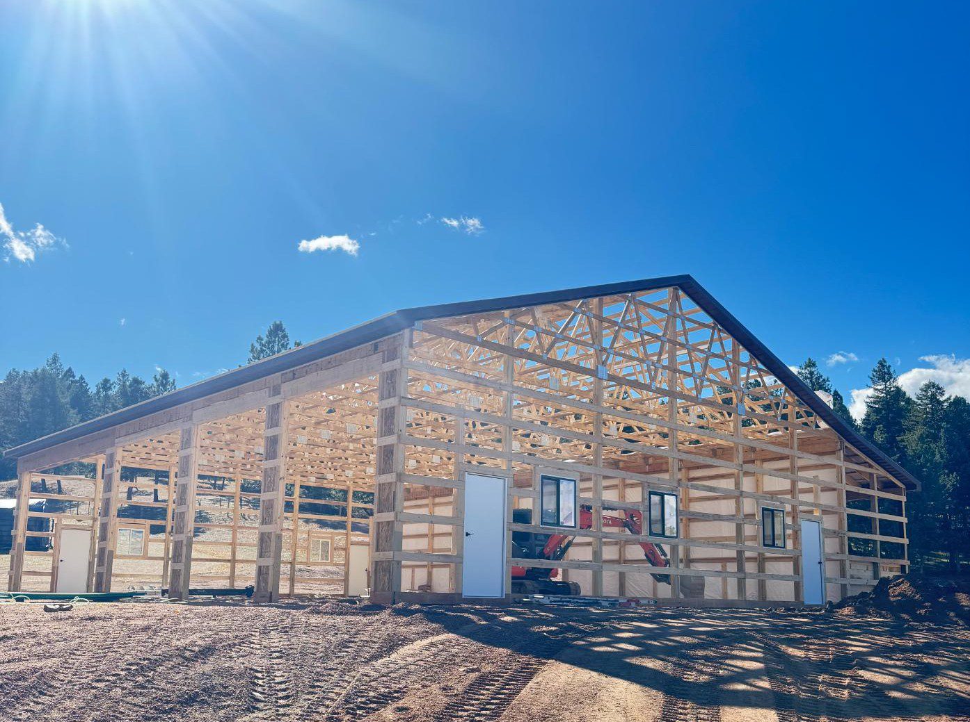 This custom pole barn garage features a clean, modern design built for serious function and long-term value. The exterior showcases vertical metal siding in a rich, dark finish, paired with a symmetrical gable roof for a timeless look. Multiple large overhead doors provide easy access for equipment, vehicles or RV storage. Standard entry doors add everyday convenience. Simple window placement brings in natural light without sacrificing efficiency. Built to be strong, low-maintenance and adaptable, this structure is ideal for owners who want a practical, spacious building for a shop, vehicle storage or workspace that still feels polished and well thought out.